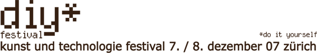 Fr./Sa. 7./8. Dezember 2007, Kunst- und Technologiefestival, Dynamo Zürich Ausstellung, Live-Konzerte, Vorträge und Workshops: Mit einem reizvollen Programm startet diy* als Plattform für das dynamische Feld elektronischer Kunst mit selbstgemachten Werkzeugen ins dritte Jahr. Information en français Partnerveranstaltung im dock18: after the beep |